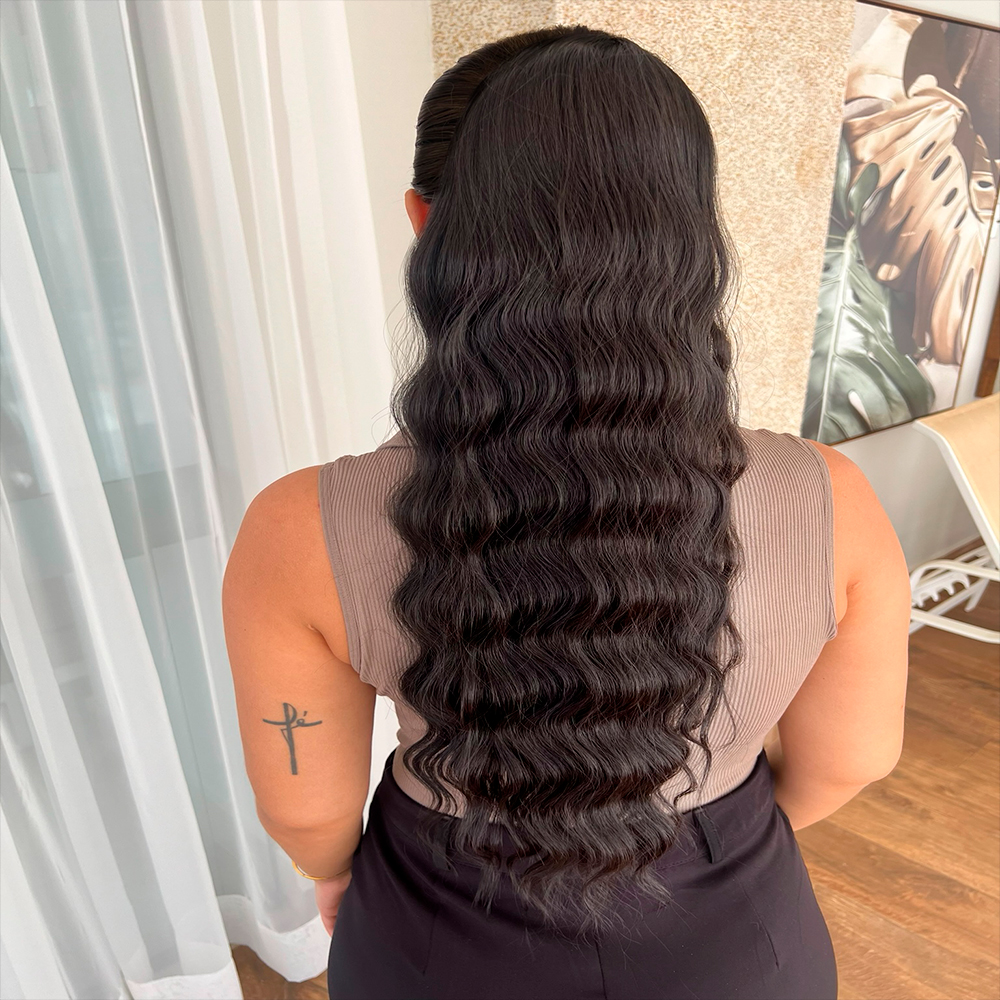 Eleve seu visual com o Wave Glam, um rabo de cavalo com ondas elegantes, caimento impecável e acabamento super natural.