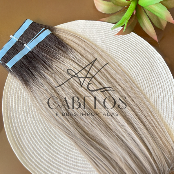 Mega Hair Fita Adesiva Fibra Russa Mesclado Platinado Esfumado 70cm Liso.